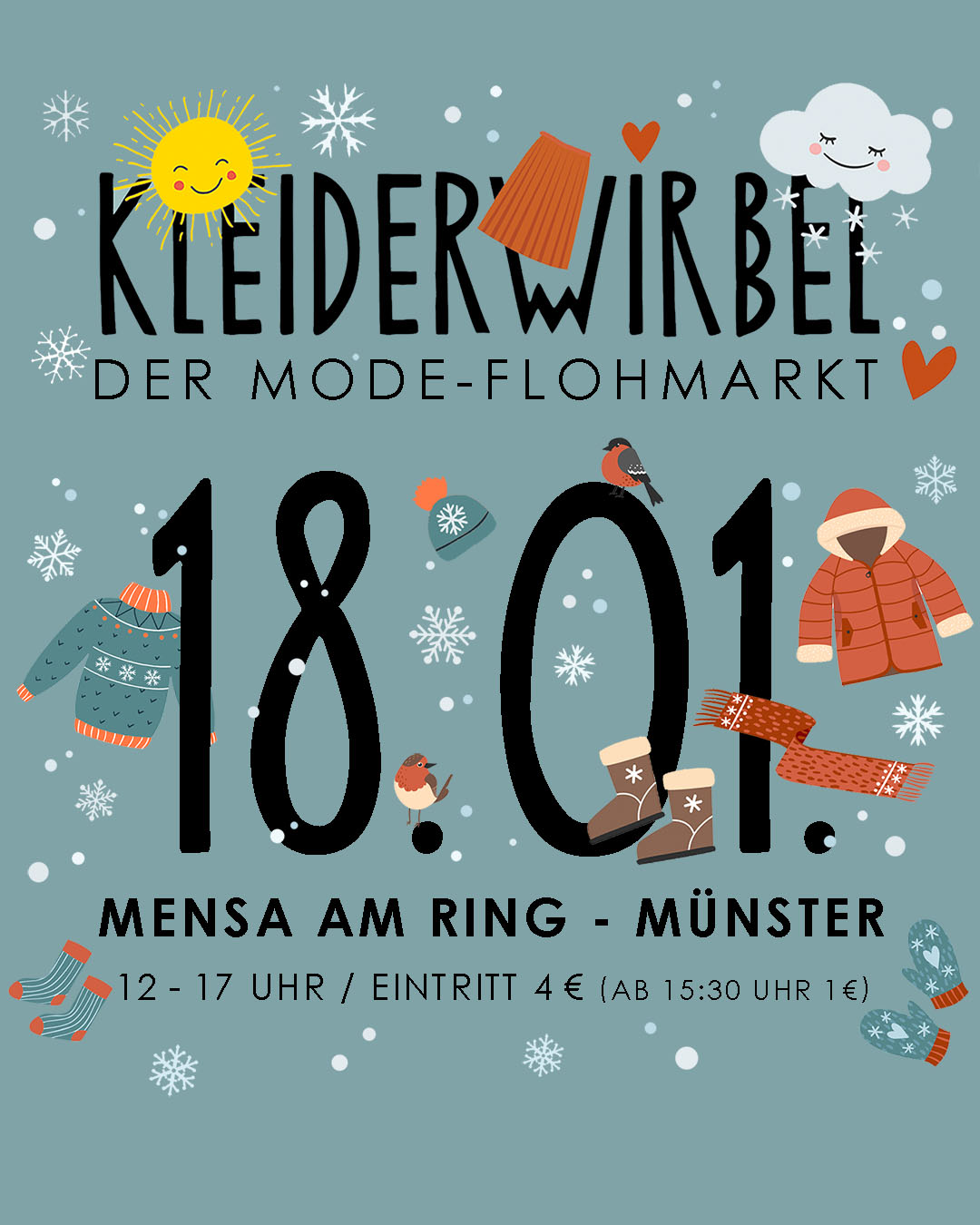 Kleiderwirbel – Der Mode-Flohmarkt ist ein Indoor-Flohmarkt für alle die nachhaltig einkaufen möchten oder auf der Suche nach ganz besonderen Lieblingsteilen sind! In der Mensa am Ring lassen ausgewählte Flohmarktschätzchen die Herzen höher schlagen. Es gibt Kleidung, Accessoires, Schuhe, Taschen – Kleiderschranküberschuss vom feinsten. Geschützt vor Wind und Wetter darf in ausgelassener Atmosphäre gestöbert, gefeilscht und eingekauft werden.